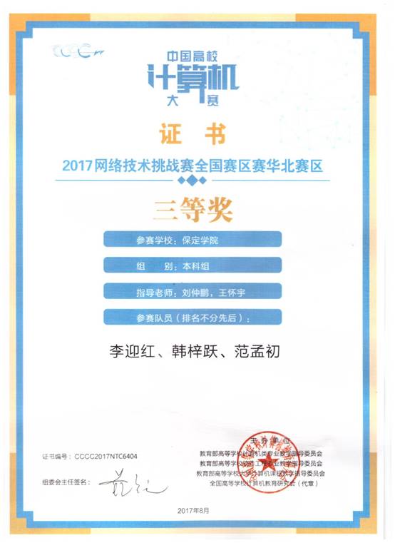 2017年7月22日,中国高校计算机大赛——2017年网络技术挑战赛华北赛区赛在北京航空航天大学举办。我院信息技术系物联网工程专业共有5支队伍入围最后的决赛,其中李迎红、韩梓跃、范孟初代表队荣获华北赛区本科组三等奖。